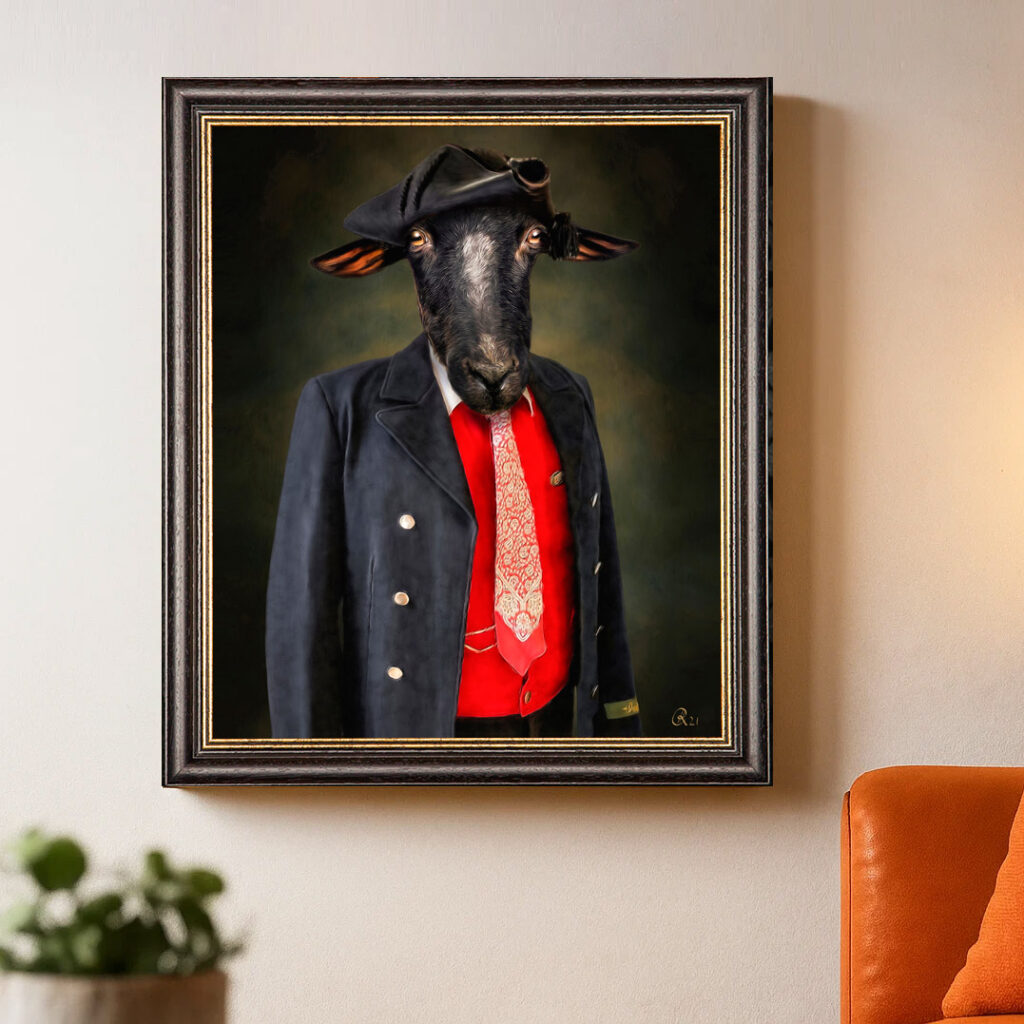 Rhönschaf “Helene”, Partnerin & Pendant von Horst, in der Original Rhöner Tracht als Fine Art Druck auf Künstlerleinwand.
